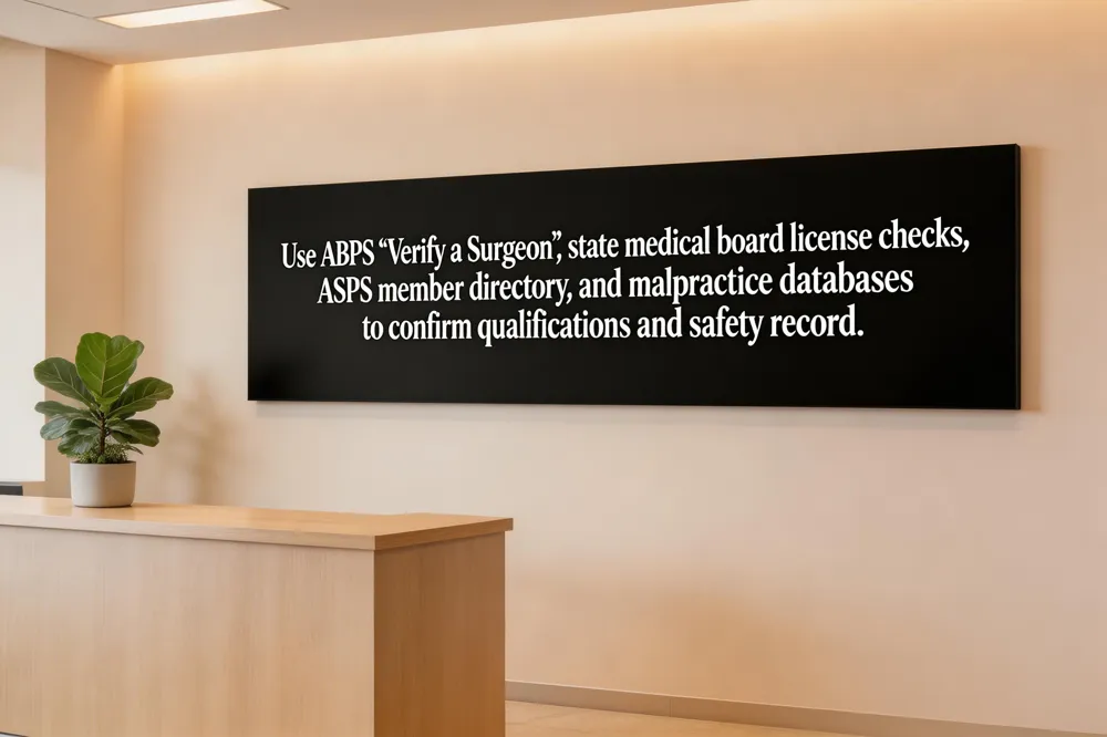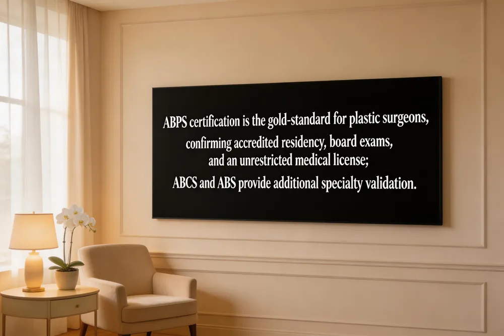 What accreditation should a plastic surgeon have? The surgeon should hold ABPS certification and a valid, unrestricted medical license, both verifiable through the Federation of State Medical Boards.