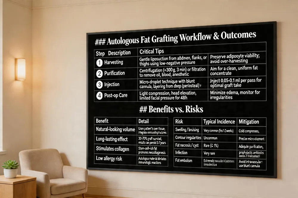 | 3️⃣ Injection | Micro‑droplet technique with blunt cannula, layering from deep (periosteal) to superficial | Inject 0.05‑0.1 ml per pass for optimal graft take |