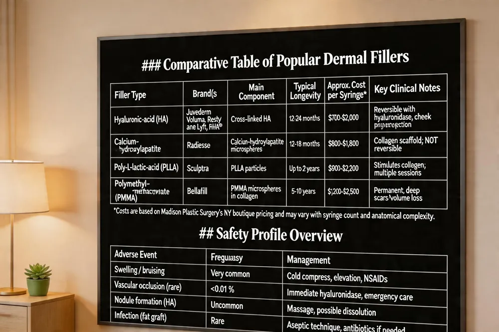 | Filler Type | Brand(s) | Main Component | Typical Longevity | Approx. Cost per Syringe* | Key Clinical Notes |