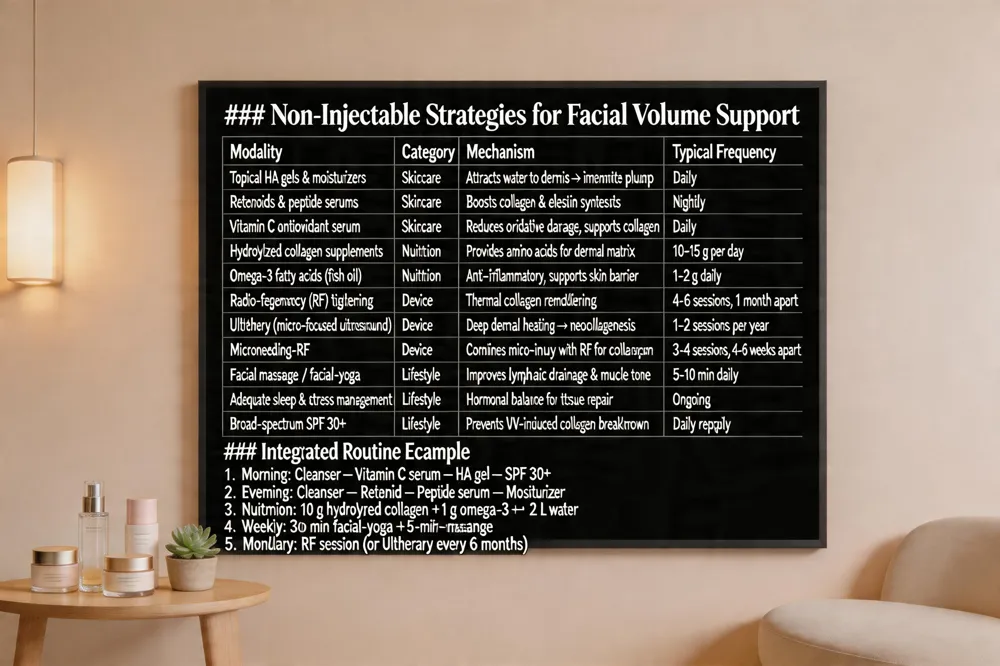 Restoring facial fullness without surgery begins with a disciplined skin‑care regimen that fuels collagen, elastin, and hyaluronic acid (HA) production. Retinoid‑based moisturizers and antioxidant‑rich serums (vitamin C, peptides, bakuchiol) stimulate dermal remodeling, while HA gels and moisturizers replenish extracellular matrix water‑binding capacity for immediate plumping. Internally, a protein‑focused diet, omega‑3 fatty acids, adequate hydration, and optional hydrolyzed‑collagen supplements provide the building blocks for resilient connective tissue.