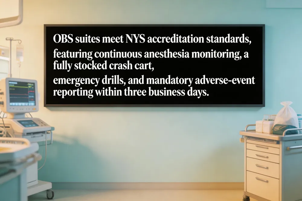 NYS Office‑Based Surgery accreditation requires every facility offering moderate or deep sedation or general anesthesia to be licensed by the New York State Department of Health and to display its accreditation certificate publicly. Madison Plastic Surgery’s OBS suites are fully compliant, meeting the Office‑Based Surgery (OBS) law’s stringent standards for sterilization, medication handling, and record‑keeping.