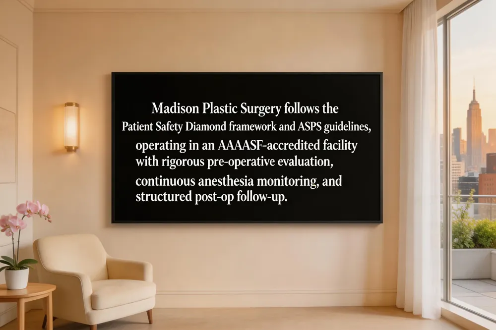 Safety is the cornerstone of every procedure at Madison Plastic Surgery. Our surgeons are board‑certified plastic surgeons who meet the rigorous training and credentialing standards set by the ASPS and the New York State Department of Health. All surgeries are performed in our AAAASF‑accredited office‑based operating facility, which adheres to strict protocols for anesthesia monitoring, sterilization, and emergency preparedness. We follow the “Patient Safety Diamond” framework, ensuring each patient is an ideal candidate, the procedure is appropriate, and the care team is highly trained. From pre‑operative evaluation through post‑operative follow‑up, we prioritize meticulous attention to detail to deliver safe, natural‑looking results.