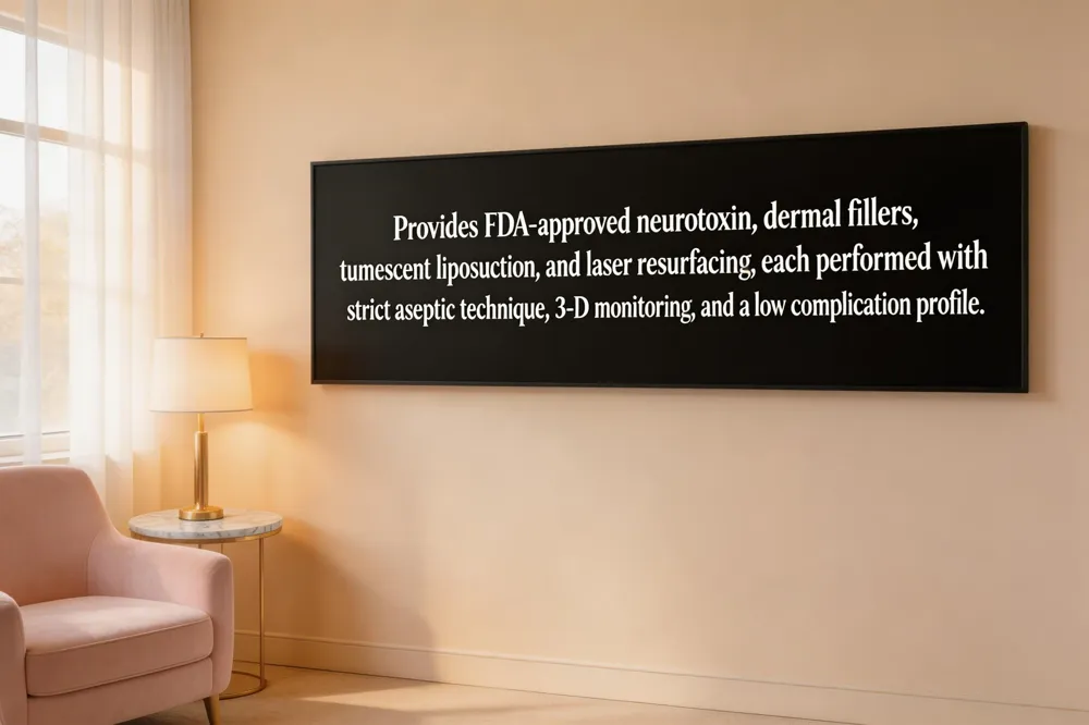 Our boutique practice blends relentless quality improvement, patient‑centered care, and refined luxury, delivering personalized, natural‑looking results while upholding the highest safety standards for every client from start.