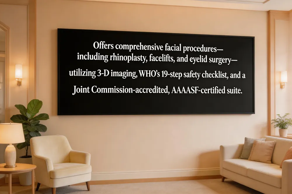 Madison Plastic Surgery delivers a full suite of facial cosmetic procedures—rhinoplasty, facelifts, eyelid surgery, cheek and chin augmentation, and minimally invasive injectables. Each operation is meticulously planned using 3‑D imaging and the latest FDA‑approved technologies, ensuring precise tissue handling, minimal incisions, and rapid same‑day discharge when appropriate. Board‑certified surgeons work in a Joint Commission‑accredited, AAAASF‑certified suite that follows WHO’s 19‑step safety checklist, strict aseptic protocols, and continuous intra‑operative monitoring, guaranteeing the highest safety standards.