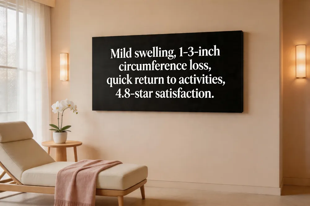 Typical outcomes at Madison Plastic Surgery include a 1‑3‑inch reduction in circumference per treated area, with smoother, tighter skin that looks natural and elegant. Visible improvement appears within a few weeks as fluid resolves, and final contour refinement continues for up to three months. Before‑and‑after galleries demonstrate modest but lasting skin tightening and contouring.