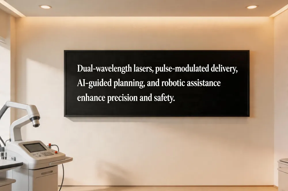 Dual‑ and multi‑wavelength laser systems (e.g., 1064 nm + 1470 nm) achieve superior fat liquefaction and collagen‑stimulating skin tightening compared with single‑wavelength devices. Pulse‑modulated delivery reduces postoperative edema by ~30 % and fiber‑optic temperature sensing lowers thermal‑injury risk by up to 40 %. Artificial‑intelligence‑guided treatment planning tailors energy settings to individual anatomy, improving patient‑satisfaction scores by as much as 20 %, while emerging robotic‑assisted platforms promise even greater precision.
