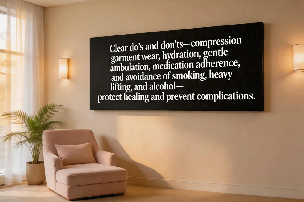 concierge‑level aftercare protocol begins with crystal‑clear do’s and don’ts to protect the delicate healing phase. Patients are instructed to keep incisions clean and dry, wear their custom‑fitted compression garment continuously for the first six weeks, and elevate the operated area whenever possible. Gentle ambulation—three short walks daily—is encouraged, while heavy lifting, vigorous exercise, and prolonged sitting are prohibited for at least two weeks.