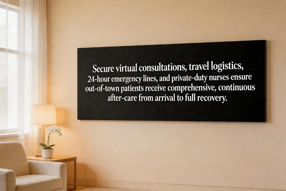 Private‑duty nursing and personalized follow‑up Post‑operative excellence is delivered by board‑certified private‑duty nurses who provide round‑the‑clock wound care, medication management, drain monitoring, and gentle mobility assistance. Nurses visit the patient’s home or hotel, manage dressings, and offer nutrition and hydration guidance, while a dedicated after‑care coordinator schedules virtual check‑ins and in‑person follow‑up appointments at critical milestones (48 hours, 1 week, 2 weeks, 1 month).