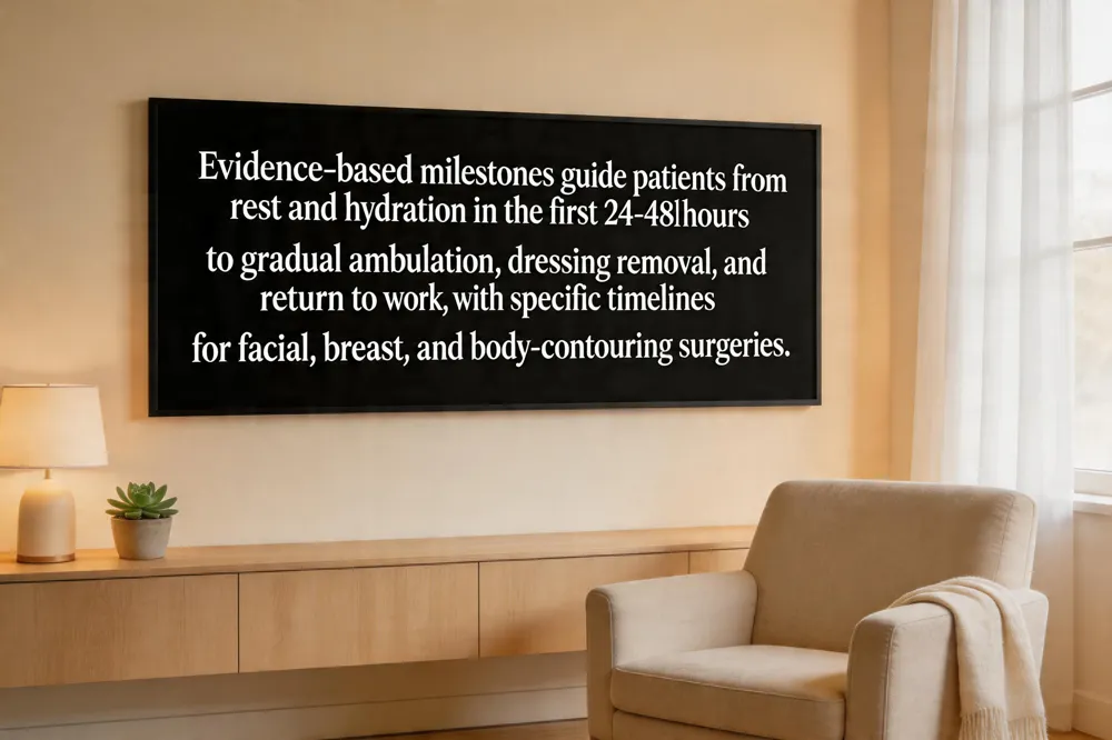 Differences by procedure type – Facial surgeries (rhinoplasty, brow lift, facelift) typically allow a return to desk work within 7‑10 days; full facial swelling usually subsides by week 2‑3, with final contour refinement emerging over 3‑12 months. Breast augmentations and lifts permit light activity after 7‑10 days and full upper‑body movement by week 4; compression garments are worn 23 hours daily for the first six weeks. Body‑contouring procedures (abdominoplasty, liposuction, tummy tuck) require a longer immobilization period: patients often need 2‑4 weeks before resuming normal household duties and 4‑6 weeks before any strenuous exercise or heavy lifting. Drains, when present, are monitored daily and removed typically after 5‑7 days.