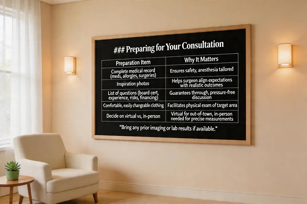 A successful Madison surgery consultation begins long before you step into the boutique suite. First, gather a complete medical record—list current medications, supplements, allergies, previous surgeries, and any chronic conditions—so the board‑certified surgeon can assess safety and tailor anesthesia plans. Next, curate inspiration photos that reflect the aesthetic results you desire; these help the surgeon match your goals with realistic, natural‑looking outcomes and guide the use of high‑resolution before‑and‑after galleries or 3‑D imaging during the visit. Prepare a concise list of questions covering board certification, surgeon experience with your specific procedure, risks, recovery timelines, financing, and after‑care protocols; this ensures the 60‑90 minute appointment is thorough and pressure‑free. Dress in comfortable, easily changeable clothing—think a soft robe or loose top—to facilitate a physical examination of the target area without inconvenience. Finally, decide whether a virtual screening or an in‑person consultation best fits your schedule; virtual meetings are ideal for out‑of‑town patients to discuss goals and review medical history, but an in‑person exam is essential for precise measurements, imaging, and personalized treatment planning. By completing these steps, you arrive informed, confident, and ready to collaborate on a bespoke aesthetic plan that prioritizes safety, elegance, and lasting satisfaction.