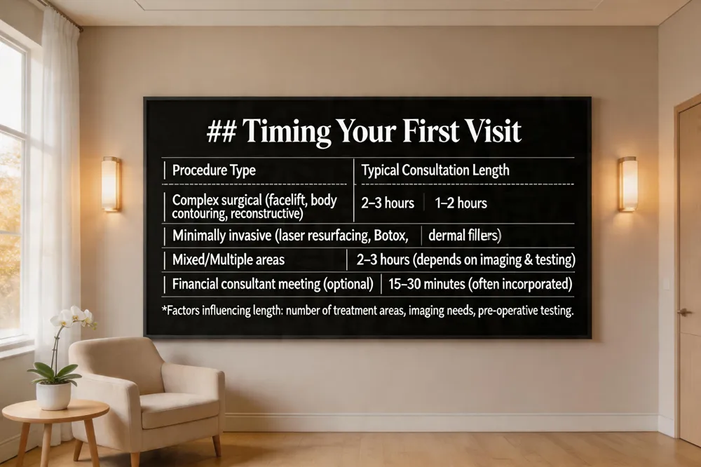 A plastic‑surgery consultation typically lasts anywhere from one to three hours, depending on the complexity of the procedure you’re considering. For more involved surgical cases—such as facelifts, body contouring, or reconstructive work—you can expect to spend roughly two to three hours at the office. Simpler, minimally invasive treatments like laser resurfacing, Botox, or dermal‑filler injections usually require about one to two hours. During that time the board‑certified surgeon reviews your detailed medical history, performs a thorough physical examination, discusses aesthetic goals, and uses high‑resolution photography or 3‑D imaging to visualize results. Factors influencing length include the number of areas being treated, the need for extensive imaging, and any pre‑operative testing. Complex procedures demand deeper anatomical assessment and a more elaborate treatment roadmap, whereas simple interventions allow a more streamlined dialogue. A brief meeting with a financial consultant is often incorporated to outline surgeon fees, anesthesia and facility charges, financing options and insurance considerations, ensuring you leave the visit fully informed and confident about the next steps.