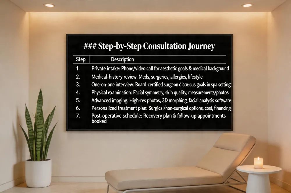 | 3. One‑on‑one interview | Board‑certified surgeon discusses goals, expectations, concerns in a spa‑like setting. |