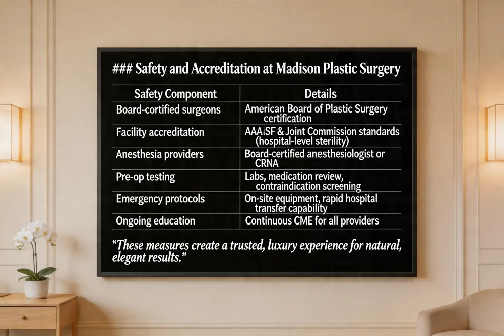 Madison Plastic Surgery puts patient safety at the forefront of every consultation and procedure. All surgeons are board‑certified by the American Board of Plastic Surgery, confirming completion of rigorous training, comprehensive exams, and ongoing education. The practice operates in facilities accredited by the American Association for Accreditation of Ambulatory Surgery Facilities (AAAASF) and meets Joint Commission standards, guaranteeing a sterile, hospital‑level environment. Anesthesia is administered by a board‑certified anesthesiologist or a Certified Registered Nurse Anesthetist (CRNA) with verified credentials, ensuring optimal monitoring throughout the operation. Prior to surgery, patients undergo thorough pre‑operative laboratory testing and medication reviews to identify any contraindications and tailor anesthesia plans. Madison Plastic Surgery also maintains detailed emergency protocols, including on‑site emergency equipment and rapid access to nearby hospitals, providing an additional layer of protection. This comprehensive safety framework—board certification, accredited surgical suites, qualified anesthesia providers, rigorous pre‑op testing, and robust emergency preparedness—creates a trusted, luxury experience for discerning clients seeking natural, elegant results.