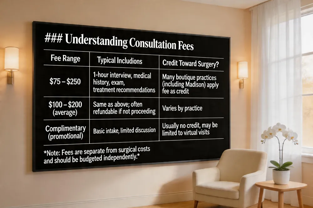 | $75 – $250 | 1‑hour interview, medical history, exam, treatment recommendations | Many boutique practices (including Madison) apply fee as credit |