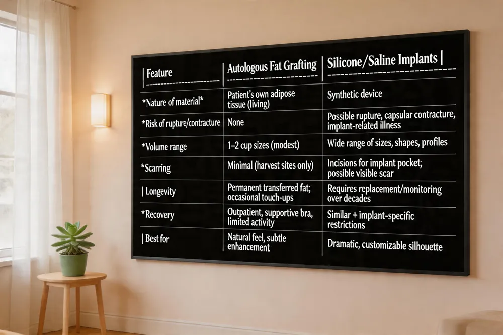 When patients seek a subtle, lifelike enhancement, autologous fat grafting is the premier natural breast augmentation. The surgeon harvests excess adipose tissue from the abdomen, flanks, thighs or back, purifies it, and injects it in layered parcels to mimic the breast’s native softness and mobility. Because the tissue is the patient’s own, there is no risk of rupture, capsular contracture, or implant‑related illness, and the result ages naturally with the body. Compared with silicone or saline implants, fat grafting offers a scar‑free, implant‑free contour but is limited to modest volume gains—typically one to two cup sizes—and may require multiple sessions to achieve the desired shape. Implants provide a broader range of sizes, shapes and profiles, yet carry synthetic set of device‑specific complications and long‑term surveillance. The choice hinges on whether the patient prioritizes a barely‑there, organic feel (fat graft the) or a more dramatic, customizable silhouette (implants). At Madison Plastic Surgery, we tailor each option to the individual’s anatomy, lifestyle and aesthetic goals, ensuring a refined, natural result.