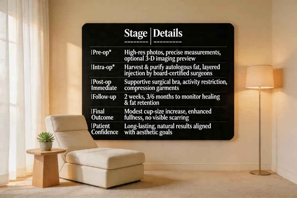 Natural breast augmentation with autologous fat grafting delivers a subtle, soft increase that preserves the breast’s gentle slope, movement, and tactile quality—creating a "no‑surgery look." Prior to any incision, the surgeon records the patient’s anatomy through high‑resolution photographs, precise measurements, and often 3‑D imaging and simulation, allowing a realistic preview of volume and contour changes. During the outpatient procedure, board‑certified surgeons harvest and purify the patient’s own fat, then inject it layer‑by‑layer into multiple breast planes for optimal graft survival. Post‑operative care includes a supportive surgical bra, brief activity restriction, and scheduled follow‑up visits at two weeks, three months, and six months to monitor healing, fat retention, and any imaging concerns. The final comparison typically shows a modest cup‑size increase, enhanced fullness, and a natural feel that blends seamlessly with surrounding tissue, giving patients lasting confidence without visible scarring or implant‑related risks.