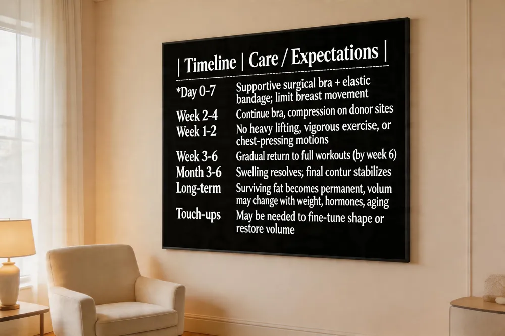 Final contour after autologous fat grafting typically stabilizes between three and six months, as residual swelling resolves and the newly‑vascularized fat integrates with native tissue. During the first week patients wear a supportive surgical bra and an elastic bandage to minimize breast movements and promote even graft take; the bra is usually continued for another two weeks with additional compression on the donor sites. Activity restrictions are strict initially—no heavy lifting, vigorous exercise, or chest‑pressing motions for at least one week, and most surgeons advise a gradual return to full workouts by the third to sixth week. Long‑term, the surviving portion of the transferred fat becomes a permanent component of the breast, offering a natural feel that endures for years. However, because fat is living tissue, modest volume changes can occur with significant weight fluctuations, hormonal shifts, or aging, and occasional touch‑up grafts may be needed to preserve the desired shape.