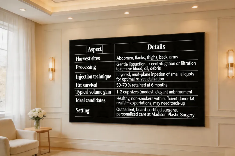 At Madison Plastic Surgery, every journey begins with a personalized, in‑depth consultation where board‑certified surgeons assess your anatomy, donor‑site volume, and aesthetic goals. By employing the latest autologous fat‑grafting techniques—centrifugation, layered micro‑injection, and optional pre‑expansion—we guarantee a natural contour while preserving the integrity of surrounding tissue. Our commitment to safety is rooted in strict aseptic protocols, meticulous patient selection (non‑smokers, stable weight, adequate donor fat), and comprehensive postoperative monitoring, including radiology brief for mammographic clarity. For those ready to embrace a subtle, implant‑free enhancement, the next step is a confidential appointment to discuss individualized treatment planning, financing options, and a tailored recovery roadmap that restores confidence with elegance.
