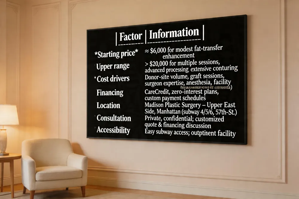 Natural breast augmentation in New York City is a premium, boutique service. Prices typically start around $6,000 for a modest fat‑transfer enhancement and can exceed $20,000 when multiple sessions, advanced processing, or extensive body‑contouring are required. Factors that drive total cost include donor‑site fat volume, the number of grafting sessions, surgeon expertise, anesthesia, accredited surgical‑facility fees, and follow‑up care such as compression garments. most Hospitals.aring institutions offer financing, including CareCredit, zero‑interest plans, and custom payment schedules to make the investment more manageable. Madison Plastic Surgery, located in the heart of Manhattan’s Upper East Side, provides easy access via subway lines 4/5/6 and 57th‑St. Lines The practice combines board‑certified surgeons, state‑of‑the‑art liposuction, and personalized consultations to craft a natural‑looking result that aligns with each patient’s aesthetic goals and lifestyle. Schedule a private, confidential consultation to receive a customized quote and discuss financing options tailored to your needs.