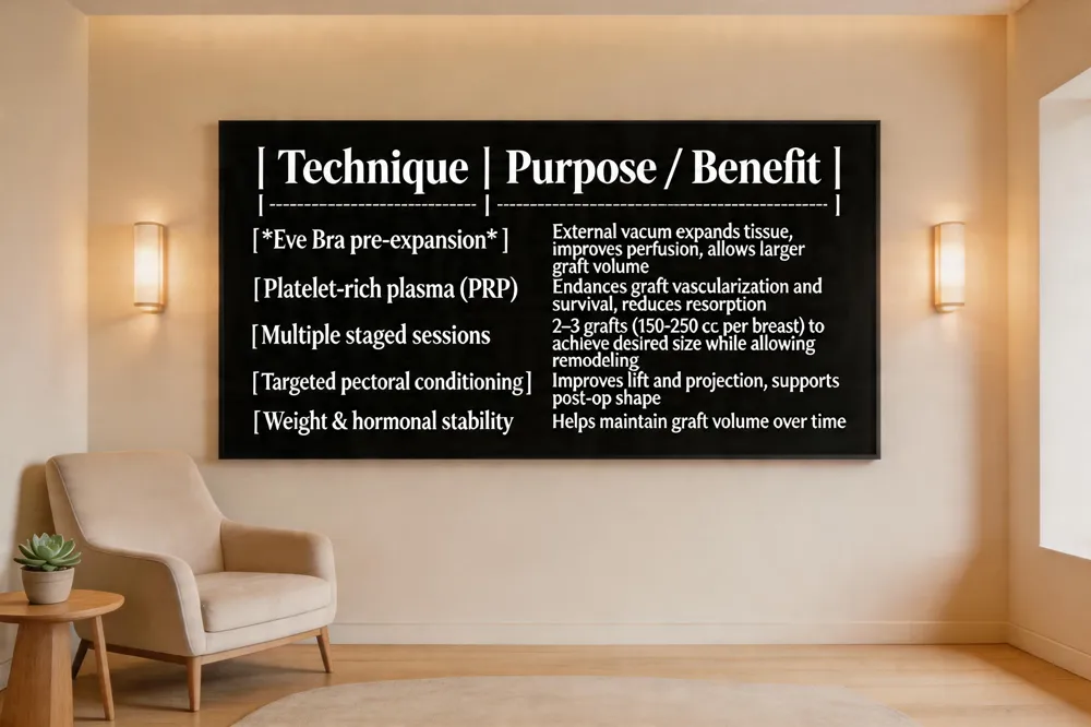 Multiple staged sessions – Because 30‑50 % of transferred fat is re‑absorbed, surgeons often plan two‑to‑three staggered grafts, each delivering 150‑250 cc per breast, to achieve the desired cup‑size increase while allowing tissue to remodel gradually.