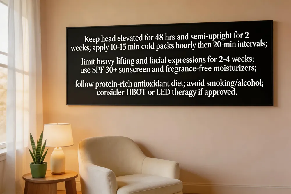 - Fastest way to recover? Follow your surgeon’s instructions, elevate the head, apply intermittent cold compresses, stay hydrated, eat nutrient‑dense foods, avoid smoking/alcohol, and consider adjunctive HBOT or LED therapy.