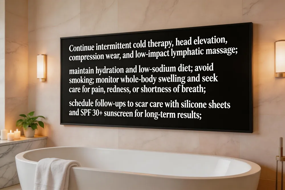 - How to speed up recovery? Same core steps—strict head elevation, scheduled cryotherapy, anti‑inflammatory diet, ample rest, and limited facial expression—plus any physician‑prescribed adjuncts.
