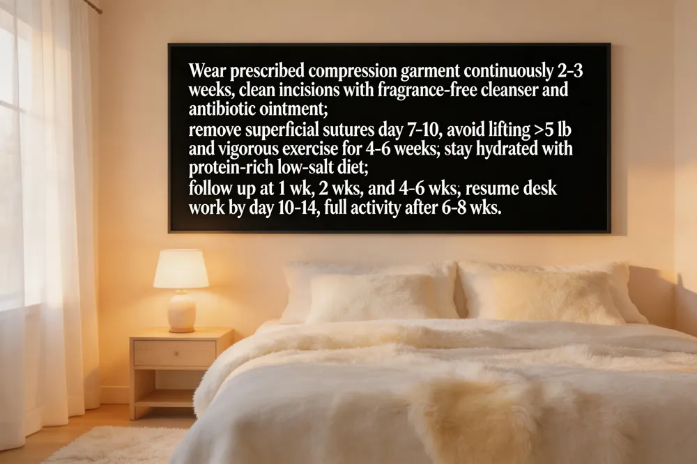 A successful abdominoplasty or mastopexy hinges on meticulous post‑operative care. Compression garment usage: wear the prescribed abdominal or surgical bra compression continuously for the first 2‑3 weeks; this gentle pressure curtails edema, supports tissue planes and helps the incisions adhere properly. Incision care and suture timeline: keep the incision sites clean with a fragrance‑free cleanser, apply any prescribed antibiotic ointment, and change dressings as directed. Most surgeons remove superficial sutures around day 7‑10, while deep absorbable sutures dissolve within 2‑4 weeks. Activity restrictions and lifting limits: avoid heavy lifting (>5 lb) and vigorous exercise for at least 4‑6 weeks; short, frequent walks promote circulation without stressing the repair. Dietary recommendations and sodium control: stay well‑hydrated (8‑10 glasses water daily) and consume a protein‑rich, low‑salt diet rich in vitamins C, E and omega‑3 fatty acids to support collagen synthesis and limit fluid retention. Follow‑up schedule and return to work: typical follow‑ups occur at 1 week (suture check), 2 weeks (initial healing assessment), and 4‑6 weeks (final evaluation). Most patients resume desk‑type work by day 10‑14, while full activity and heavy lifting are cleared after 6‑8 weeks.