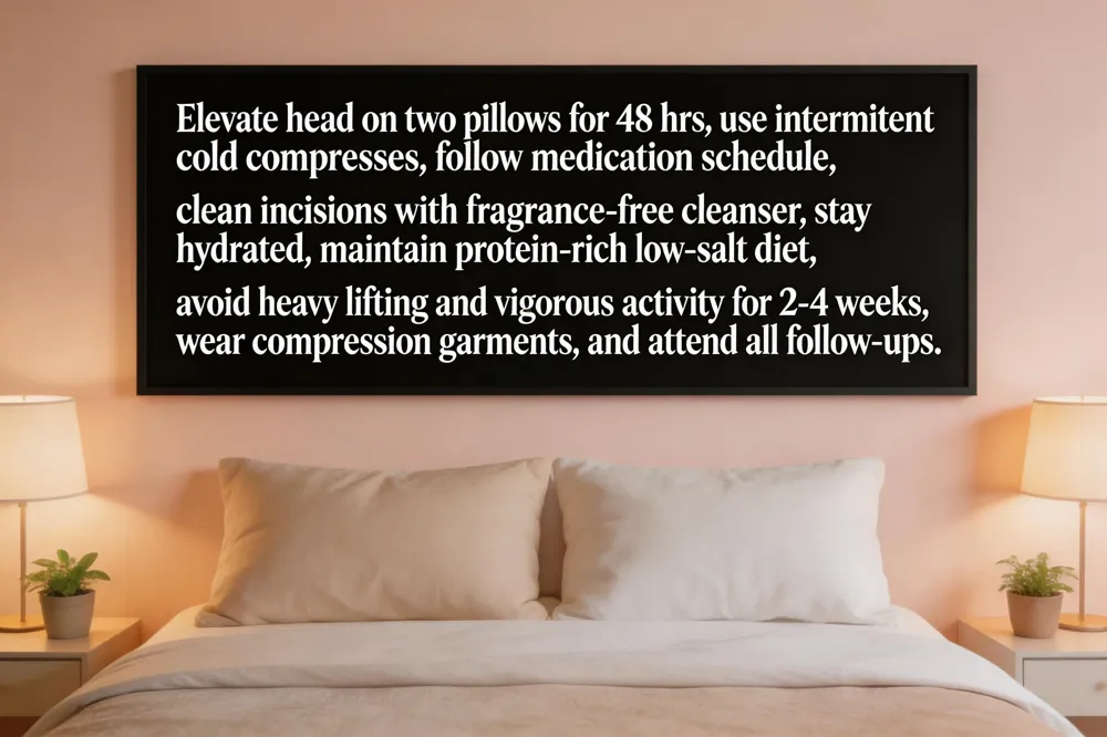 Create a sanctuary for recovery by arranging a serene space stocked with plush pillows, soft blankets, chilled water, nutritious snacks, and easy‑access entertainment; this minimizes stress and encourages restful sleep. Elevate the head on two or more pillows to promote venous return and reduce facial edema. Hydration is paramount—drink at least eight glasses of water daily—to support cellular repair, while a balanced diet rich in lean protein, vitamins C and E, omega‑3 fatty acids, and low‑sodium foods fuels collagen synthesis and curtails fluid retention. Prioritize uninterrupted rest and gentle sleep, allowing the body to allocate energy to tissue regeneration. Above all, adhere meticulously to the surgeon’s personalized post‑operative plan, including incision care, medication timing, activity restrictions, and follow‑up schedule; these instructions are calibrated to your anatomy and procedural nuances and are the cornerstone of a safe, swift, and elegant recovery.