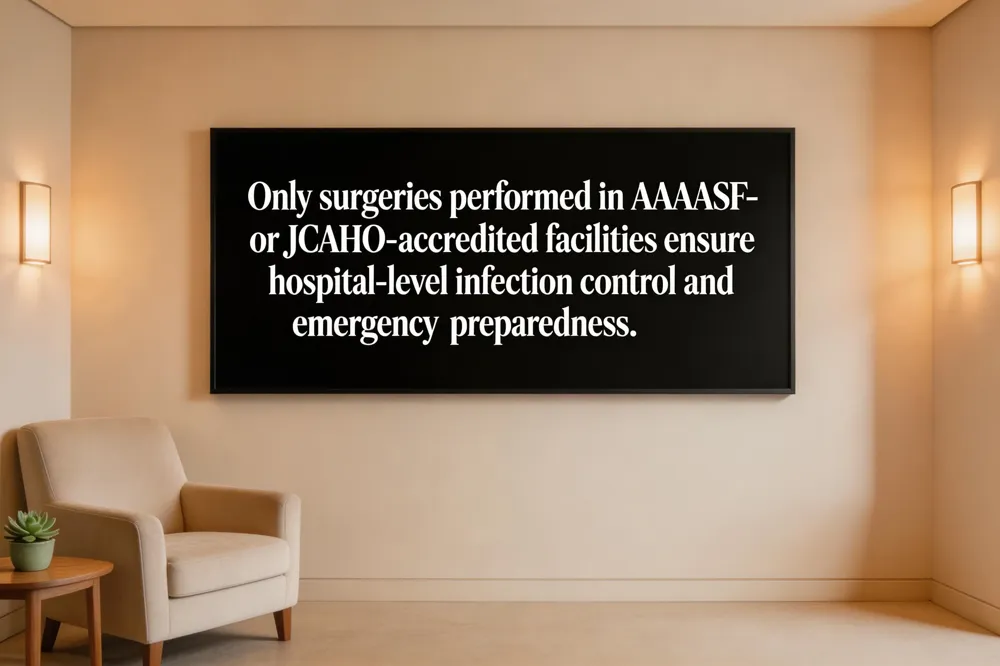 Key safety points: choose a board‑certified surgeon (ABPS or ABCS), verify high‑volume experience, ensure anesthesia is delivered by a CRNA or anesthesiologist, and disclose full medical history. Accreditation and certification summary: procedures should be performed in facilities accredited by AAAASF, AAAHC, JCAHO, or the Joint Commission, which enforce strict infection‑control, emergency preparedness, and life‑support standards. Certified surgeons maintain continuous certification, adhere to ASPS/ACS ethical codes, and operate in accredited settings to minimize complications.