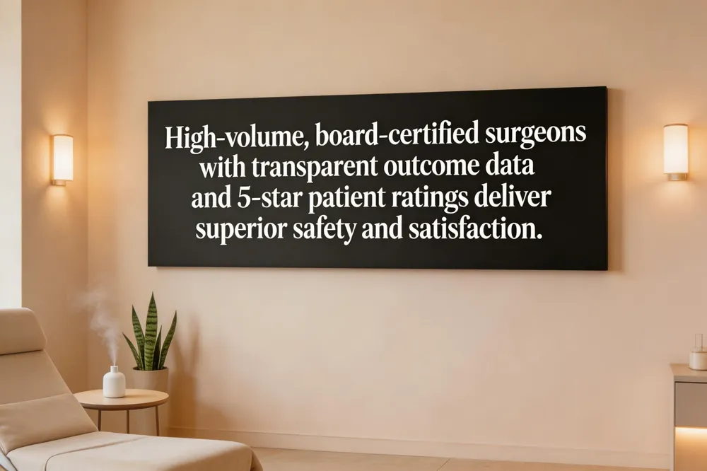 Complication rates are essential safety data. Public sources—ProPublica’s Surgeon Scorecard, Medicare Hospital Compare, and state health‑department portals—provide procedure‑specific mortality and infection percentages. Many practices also publish their own outcome reports on infection, revision, and adverse events. High‑volume surgeons (≥100 similar cases per year) consistently show lower complication rates, per ASPS data.