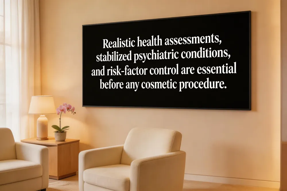 Candidates are disqualified when their goals are unattainable or when untreated psychiatric conditions—such as severe depression or body‑dysmorphic disorder—are present; these must be stabilized before any procedure. Uncontrolled medical problems—including diabetes, cardiovascular disease, clotting disorders, or a history of poor wound healing—also preclude surgery, as do modifiable risk factors like smoking, obesity, and substance abuse, which dramatically increase infection, delayed healing, and thromboembolic complications. Financial readiness and a firm commitment to postoperative care are equally essential.
